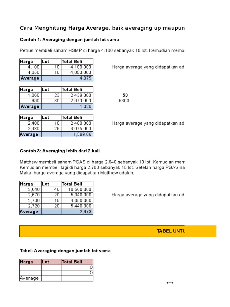 Advantages of Averaging Down. Maka sisa saham TLKM anda adalah 20 lot. Maka untuk hitung harga averagenya.
